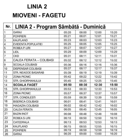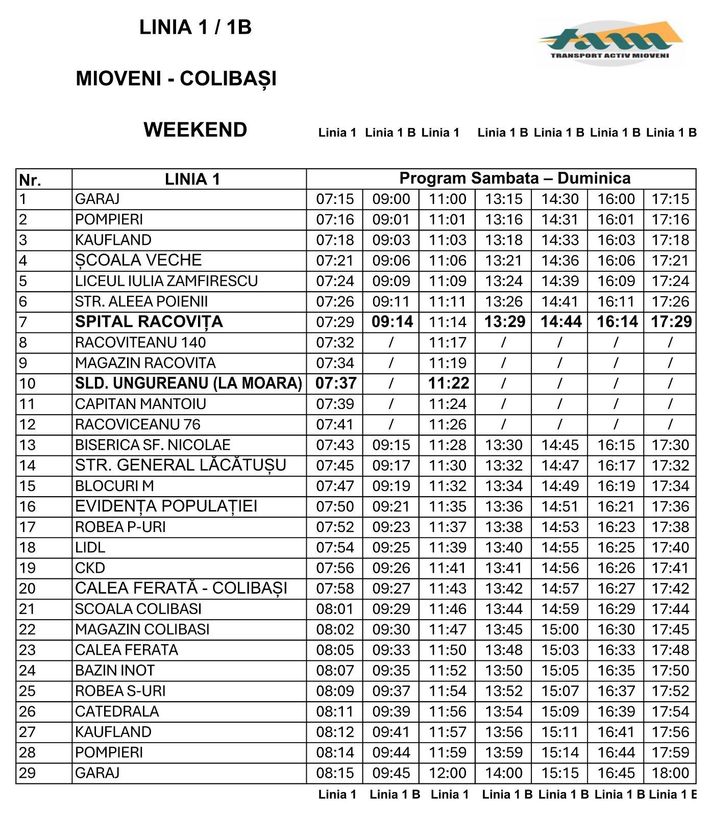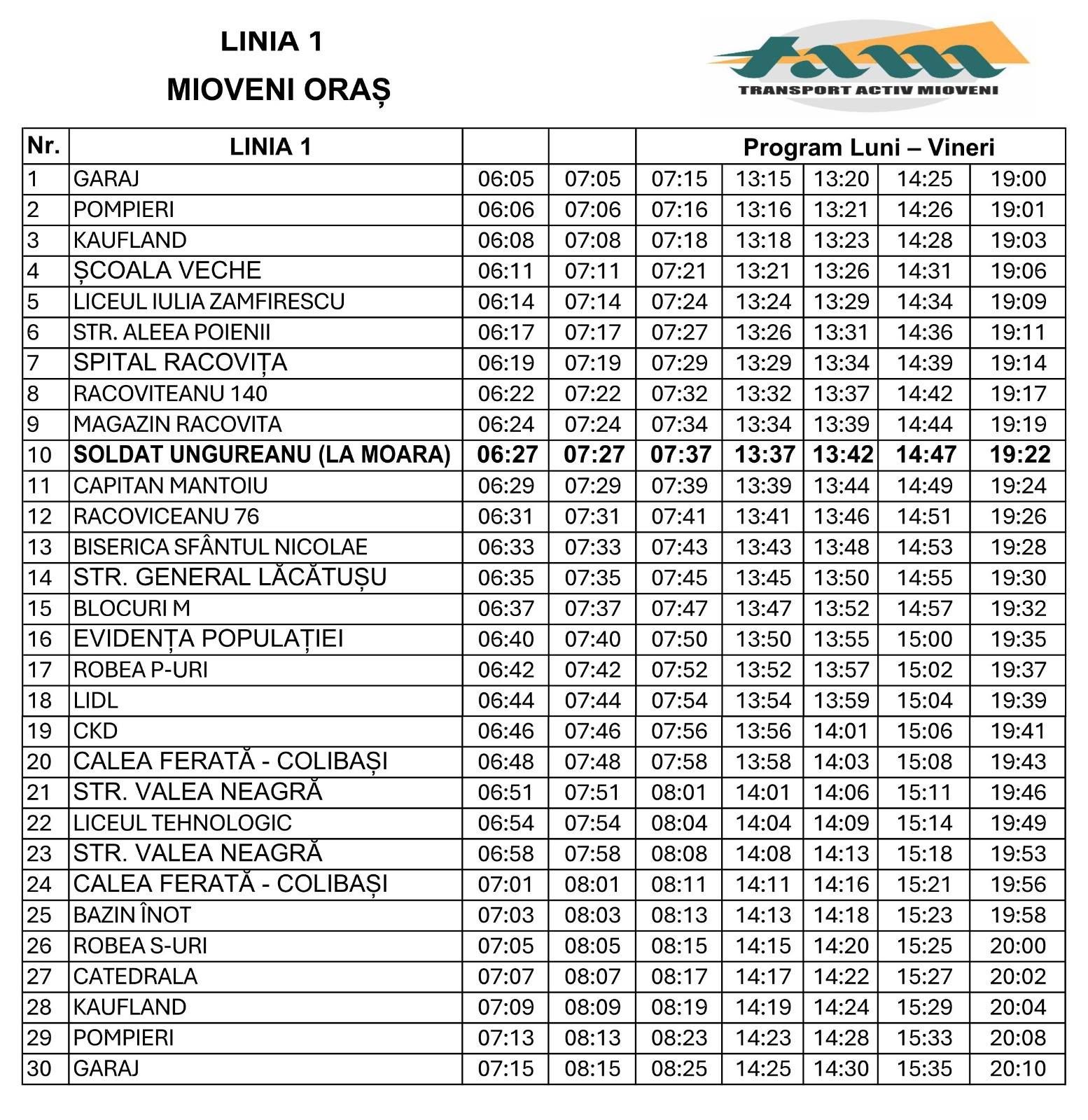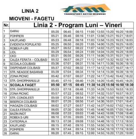 Societatea Transport Activ Mioveni SRL informează că, începând de joi, 25 septembrie, Linia 1 și Linia 2, care deservesc orașul Mioveni și zona Făgetu, vor circula după un program actualizat, în urma solicitărilor primite de la cetățeni.