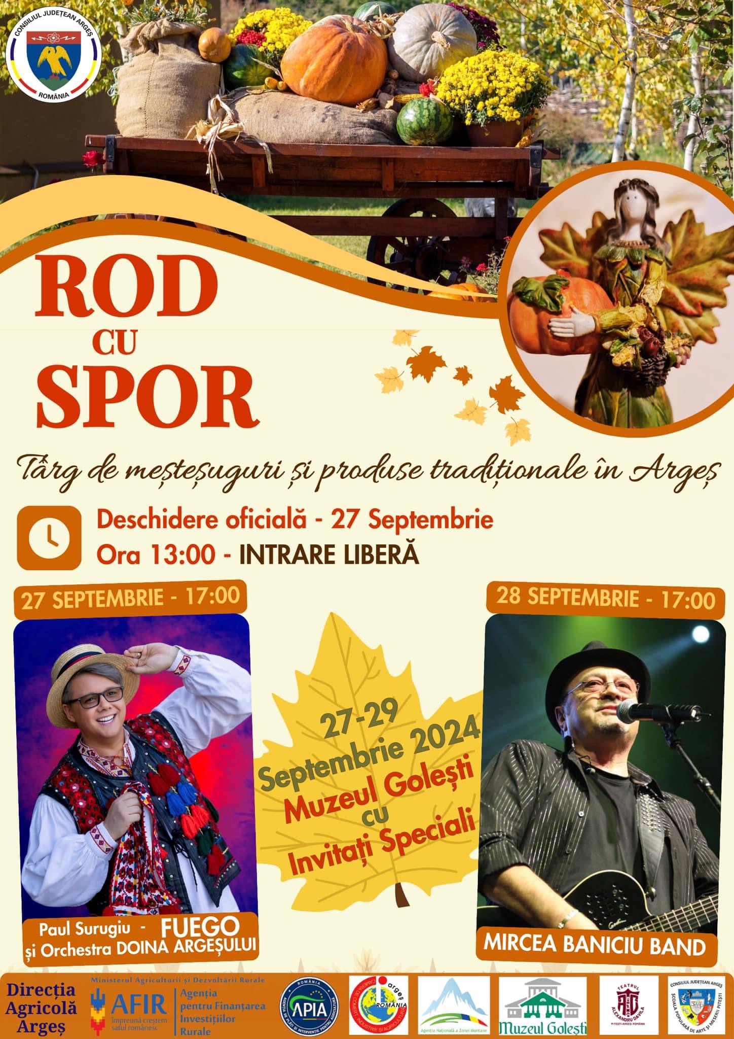 În perioada 27 – 29 septembrie 2024, Consiliul Județean Argeș organizează, la Muzeul Golești, o nouă ediție a celui mai frumos Târg de meșteșuguri și produse tradiționale din Argeș “ROD CU SPOR”!