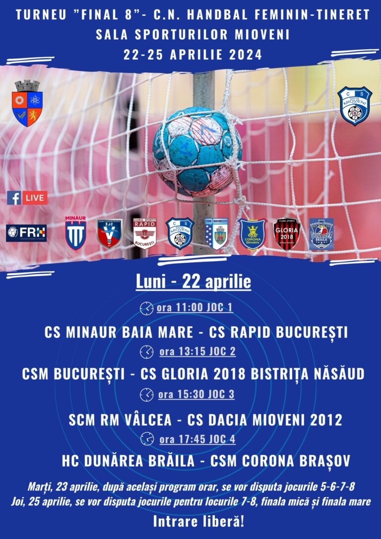 Astfel, Mioveniul va fi gazda evenimentului sportiv de importanță națională, Turneul Final de Handbal Feminin al Campionatului Național de Tineret, în perioada 22-25 aprilie. Fanii handbalului sunt invitați să asiste la meciuri și să susțină echipele favorite, cu intrare liberă.