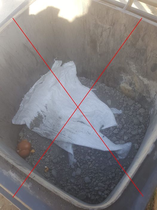 Se depozitează deșeurile reziduale – deșeurile nevalorificabile colectate separat, inclusiv cele rezultate în urma proceselor de tratare, altele decât deșeurile reciclabile, cum ar fi: resturi de carne și pește, gătite sau proaspete; resturi de produse lactate; ouă întregi; excremente ale animalelor de companie; scutece; conținutul sacului de la aspirator, mucuri de țigări; veselă din porțelan etc.