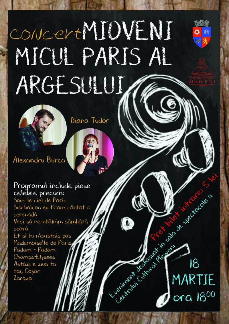 Vineri, 18 martie a.c., de la ora 18.00, Centrul Cultural Mioveni va fi gazda concertului „Mioveni, Micul Paris al Argeșului”, susținut de soprana Diana Tudor și pianistul Alexandru Burcă.