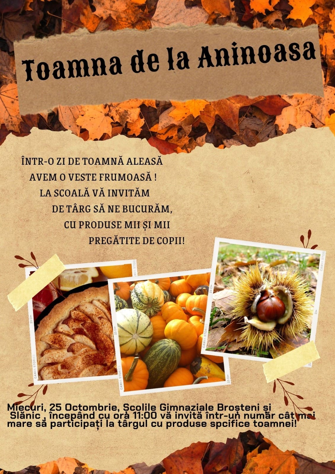Manifestare de amploare astăzi, la Aninoasa. Elevii școlilor gimnaziale din Broșteni și Slănic, vă invită să le fiți alături începând cu ora 11.00 la târgul cu produse specifice toamnei.