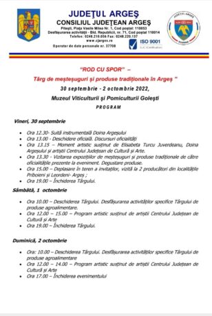 Consiliul Judetean Arges organizează, în perioada 30 septembrie – 2 octombrie 2022, la Muzeul Viticulturii și Pomiculturii Golești, Târgul de meșteșuguri și produse tradiționale în Argeș “ROD CU SPOR”.