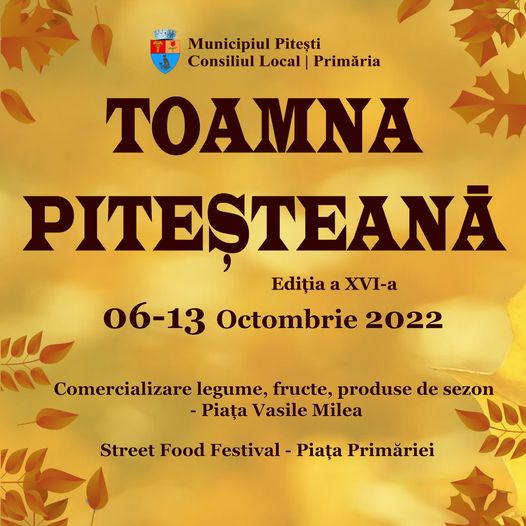 În perioada 06-13 octombrie 2022, la Pitești, se va desfășura ediția a XVI-a a festivalului „Toamna Piteșteană”. Evenimentul reunește peste 100 de participanți care vor prezenta o variată ofertă de produse: legume și fructe – proaspete și conservate, vin, must, produse apicole și zaharoase, conserve de sezon, produse alimentare tradiționale din carne și lapte, flori de toamnă, plante medicinale. Ultima zi de înscriere a solicitanților a fost vineri, 23 septembrie 2022.