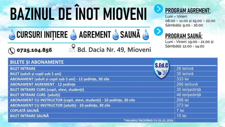 Bazinul de Înot Mioveni își reia activitatea de luni, 12 ianuarie 2026, după programul normal, anunță Servicii Edilitare pentru Comunitate Mioveni. AGREMENT: Luni – Vineri: 08.00 – 11.00 ȘI 19 – 22.00 Sâmbătă: 09.00 – 16.00 SAUNĂ: Luni – Vineri: 19.00 – 21.00 Sâmbătă: 12.00 – 14.00 Cursurile de inițiere înot se desfășoară pe grupe […]