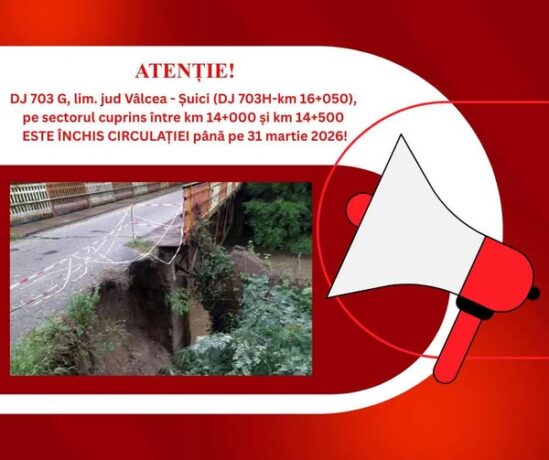 ATENȚIE! DJ 703G, lim. jud Vâlcea – Șuici (DJ 703H-km 16+050), km 14+000-19+965, pe sectorul cuprins între km 14+000 și km 14+500, rămâne închis circulației până la 31 martie 2026!