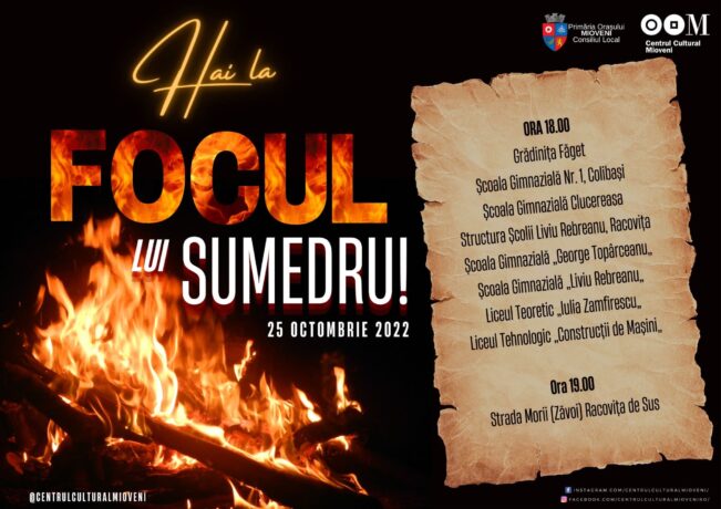 Mioveni: Invitație la Focul lui Sumedru Miercuri seara, 25 octombrie, începând cu ora 19.00, în ajunul sărbătorii Sfântului Mare Mucenic Dimitrie, în orașul Mioveni se va respecta tradiția 𝑭𝒐𝒄𝒖𝒍𝒖𝒊 𝒍𝒖𝒊 𝑺𝒖𝒎𝒆𝒅𝒓𝒖, sărbătoare cu o vechime de peste 2.000 de ani în cultura tradițională a satului românesc. Ca în fiecare an, focuri simbolice vor fi aprinse […]