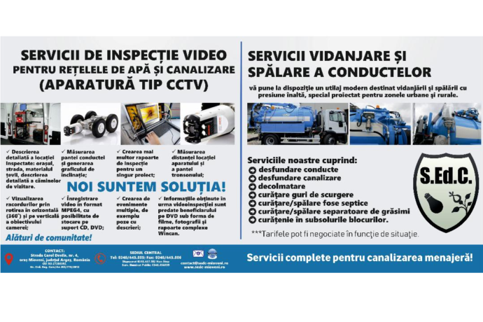 SEdC Mioveni prestează servicii de vidanjare a foselor septice și a bazinelor vidanjabile. Prețul serviciului este de 379,62 lei/oră, fără TVA, la care se adaugă costul deplasării utilajului respectiv 15,20 lei/km, fără TVA. *** tarifarea se va face pentru minim o jumătate de oră. „Punem la dispoziţie un utilaj modern destinat vidanjării şi spălării cu […]