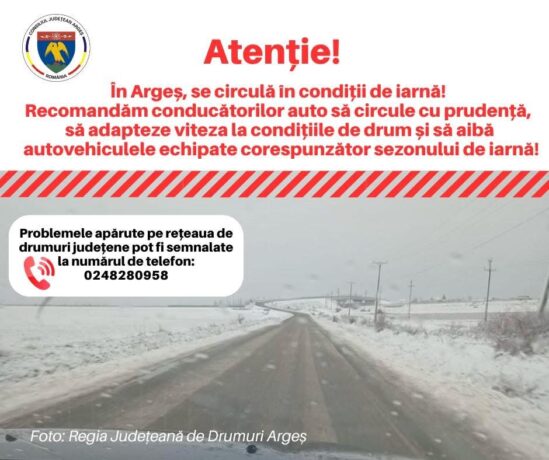 INFORMARE: În Argeș, se circulă în condiții de iarnă! CJ Argeș recomandă conducătorilor auto să circule cu prudență, să adapteze viteza la condițiile de drum și să aibă autovehiculele echipate corespunzător sezonului de iarnă! Ca urmare a precipitațiilor înregistrate în ultimele ore, Regia Județeană de Drumuri Argeș informează că, în acest moment, pe drumurile județene […]